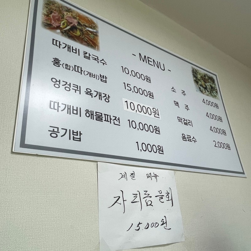 메뉴 구성은 계절에 따라 조금씩 달라질 수 있지만, 대표적인 메뉴로는 따개비칼국수(10,000원), 홍합따개비밥(15,000원), 엉겅퀴 육개장(10,000원), 따개비 해물파전(10,000원) 등이 있습니다. 음식의 맛과 퀄리티뿐만 아니라, 친절한 서비스와 깔끔한 인테리어도 인상적입니다.