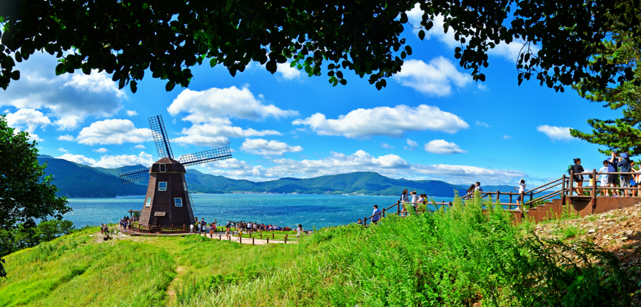 풍차 앞은 최고의 포토존입니다. 파란 하늘과 하얀 풍차, 초록 언덕을 배경으로 사진을 찍으면 누구나 동화 속 주인공이 된 듯한 기분을 느낄 수 있습니다. 특히 풍차와 함께 저 멀리 보이는 도장포 마을과 푸른 바다를 한 프레임에 담으면 더욱 멋진 사진을 남길 수 있습니다.
