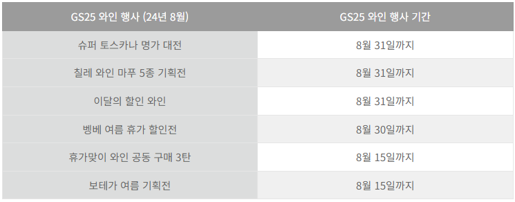 | GS25 | 슈퍼 토스카나 와인 기획전, 일본 프리미엄 맥주(삿포로 등) 4캔 할인, 신상 간편식 2+1 | 와인25+ 앱 활용, 통신사 중복 할인 |