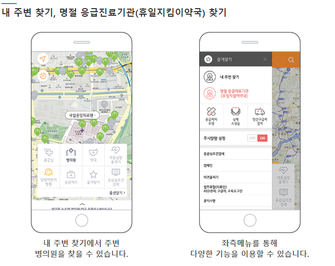 - 응급의료포털이나 휴일지킴이약국 사이트를 통해 근처의 운영 중인 병원과 약국을 확인합니다.