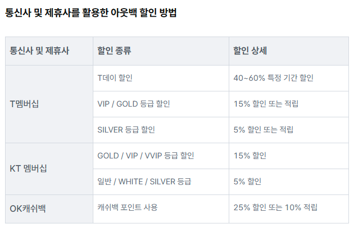 - 신한 아웃백 카드: 최대 40% 할인 (현재 신규 발급 중단)