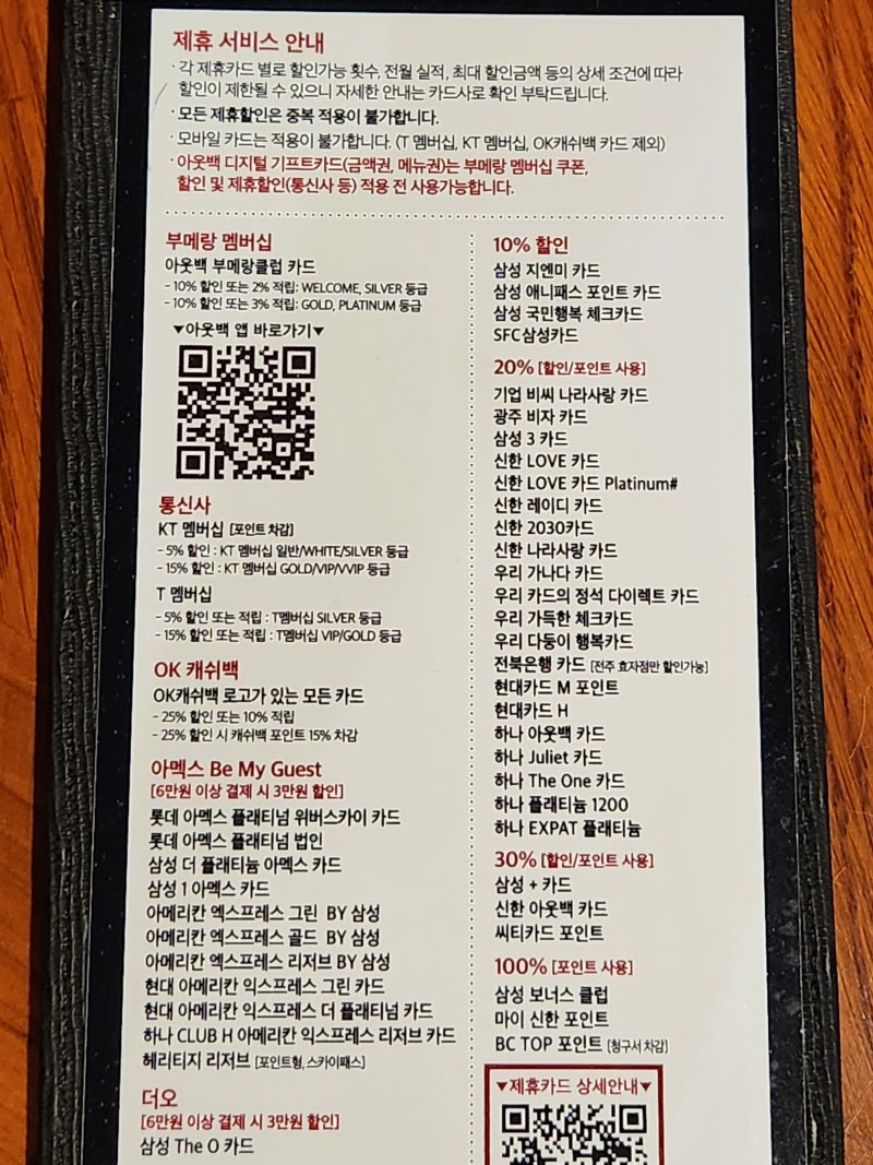 *신용카드 할인 : 아웃백에서는 다양한 신용카드사와 제휴를 맺고 있어 해당 카드로 결제 시 할인을 받을 수 있습니다. 대부분 전월 실적 조건이 있으므로 미리 확인해야 합니다.